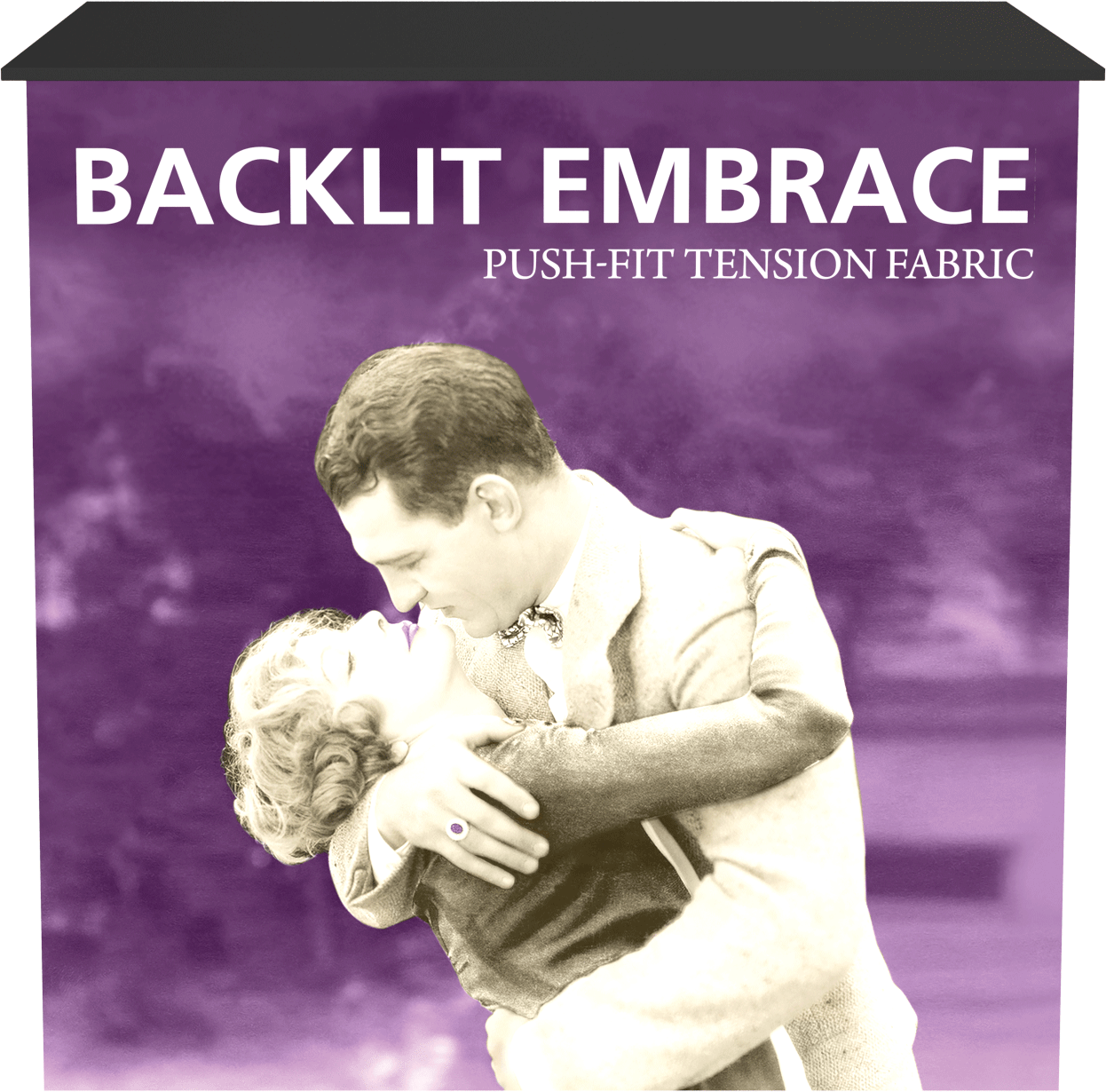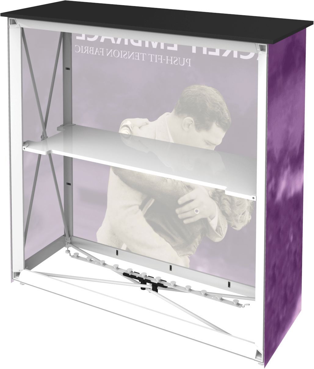 The Embrace™ Backlit Counter is a sleek, collapsible push-fit tension fabric counter that delivers a vibrant pop to branding and messaging. The Embrace Backlit Counter pairs a collapsible, white frame and channel bars that hold push-fit SEG fabric graphics. Lights attach simply to the top and bottom cross bars. The counter comes with Intensity backlit fabric graphics on the front and a whte backer. The counter is finished with a laminated counter top for a sleek appearance. Embrace Counter requires no tools for assembly, is lightweight and highly portable. It packs away as easy as it sets up!