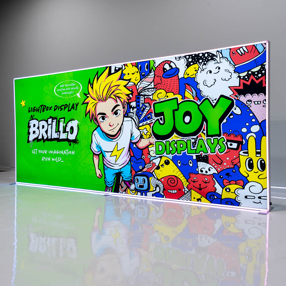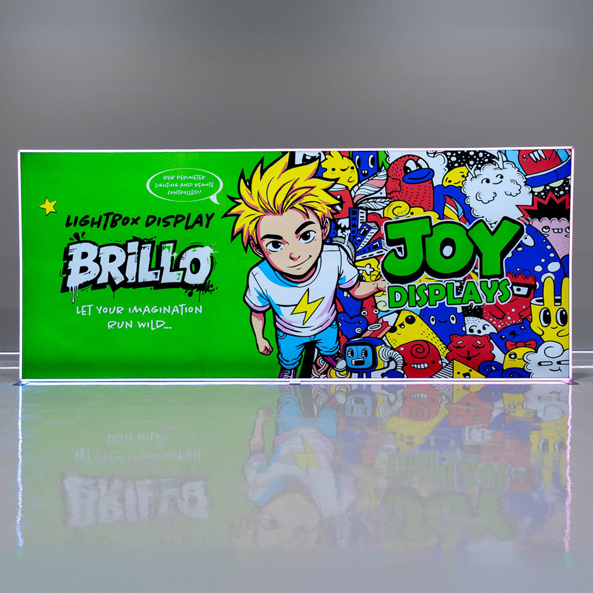 Make your booth shine with the Brillo Lightbox Line— a sleek, illuminated counter designed to attract attention and elevate your brand presence. features vibrant backlit graphics that make your branding pop, even in busy trade show environments. A dynamic perimeter light strip adds an extra visual edge, creating a glowing border that can be controlled with an included remote control for customizable lighting effects.