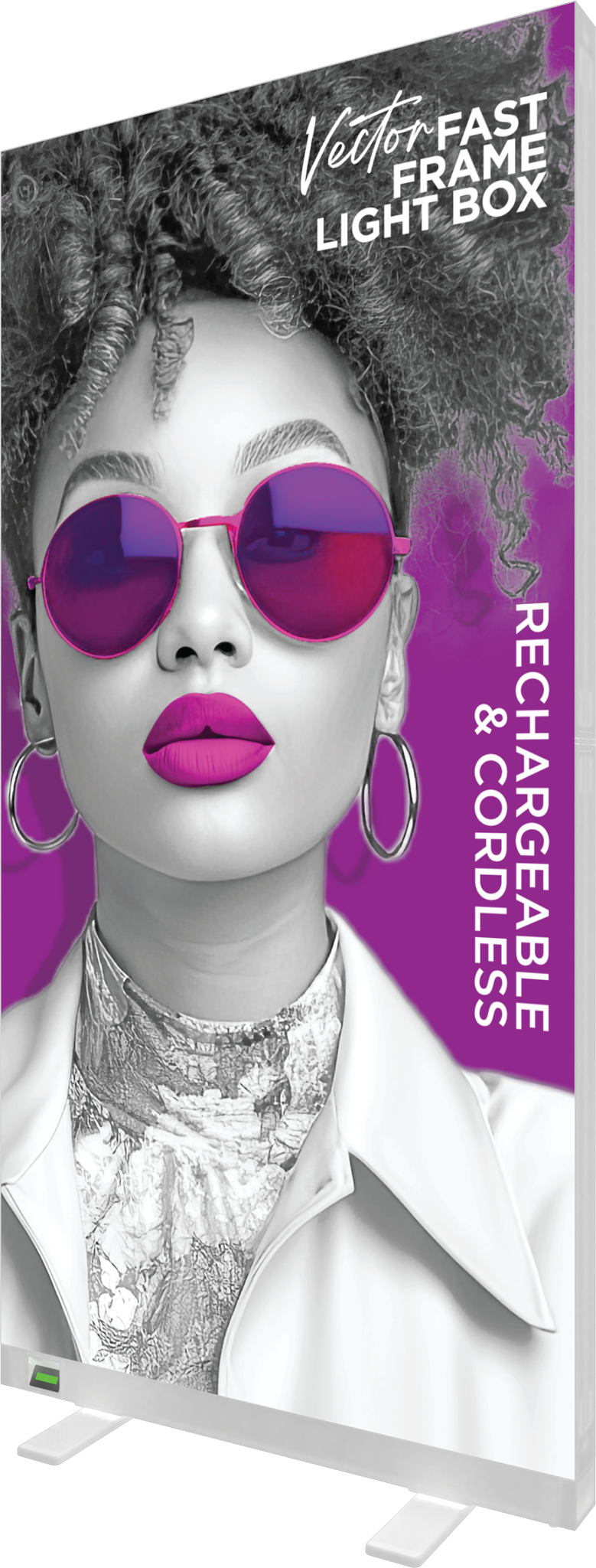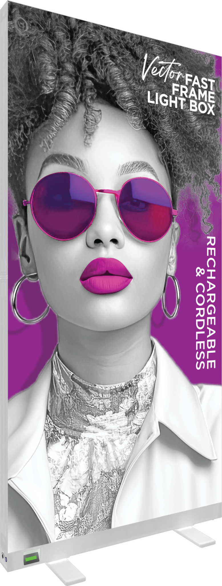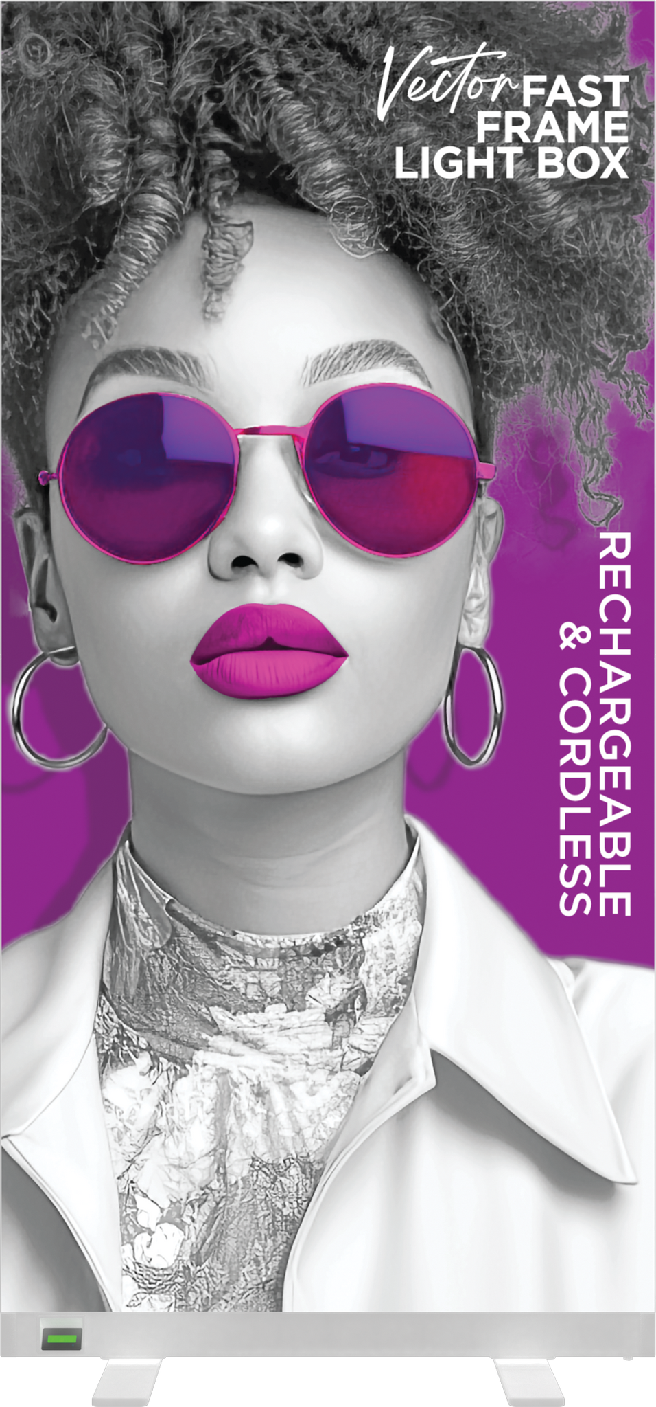 Vector Fast Frame™ Rechargeable Light Box 0307 is battery-operated and takes brands to the next level by offering the same innovative features in a cord-free design that provides up to 15 hours of runtime on a single charge. The battery can be charged in or outside of the unit and contains circuitry to prevent overcharging. The collapsible frame is slim at 3.35" deep, is 3' wide and nearly 7' tall, and has pre-attached LED lights on the left and right sides. This simple frame holds seamless, easy-to-change push-fit silicone edge graphics (SEG), which are easily applied to the front and back. Graphics can be easily swapped out to deliver new messages so you can use the frame again and again! Vector Fast Frame Rechargeable Light Box 0307 is lightweight, portable, and requires no tools, so assembly is a breeze. It packs down small, making travel and storage simple. GROUND SHIPMENT ONLY FOR UNITS WITH BATTERY INSTALLED.